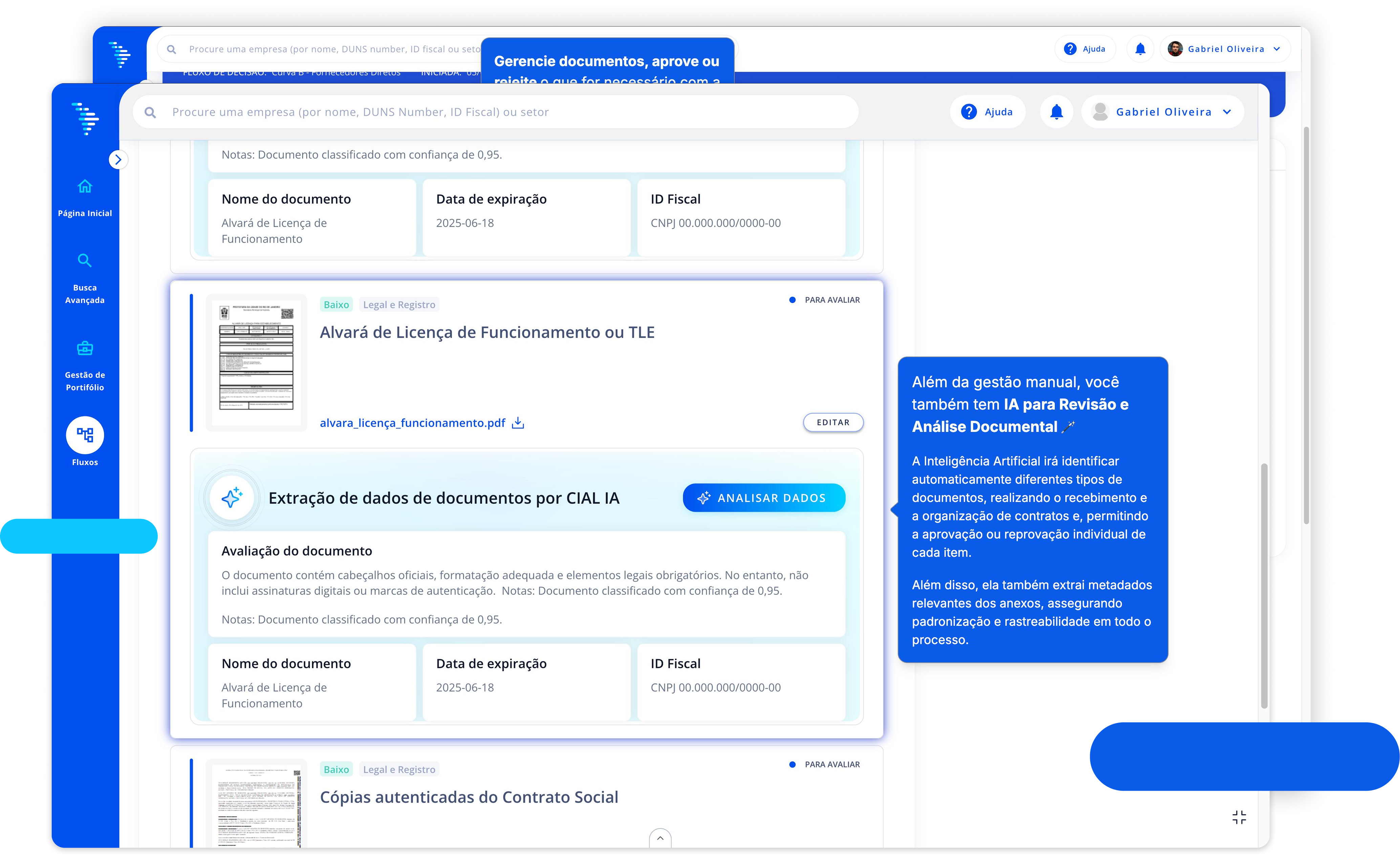 O CIAL360 Documents AI automatiza a leitura e interpretação de documentos corporativos utilizando inteligência artificial. A solução identifica, extrai e valida informações automaticamente, garantindo mais eficiência e segurança nos processos de análise documental.
